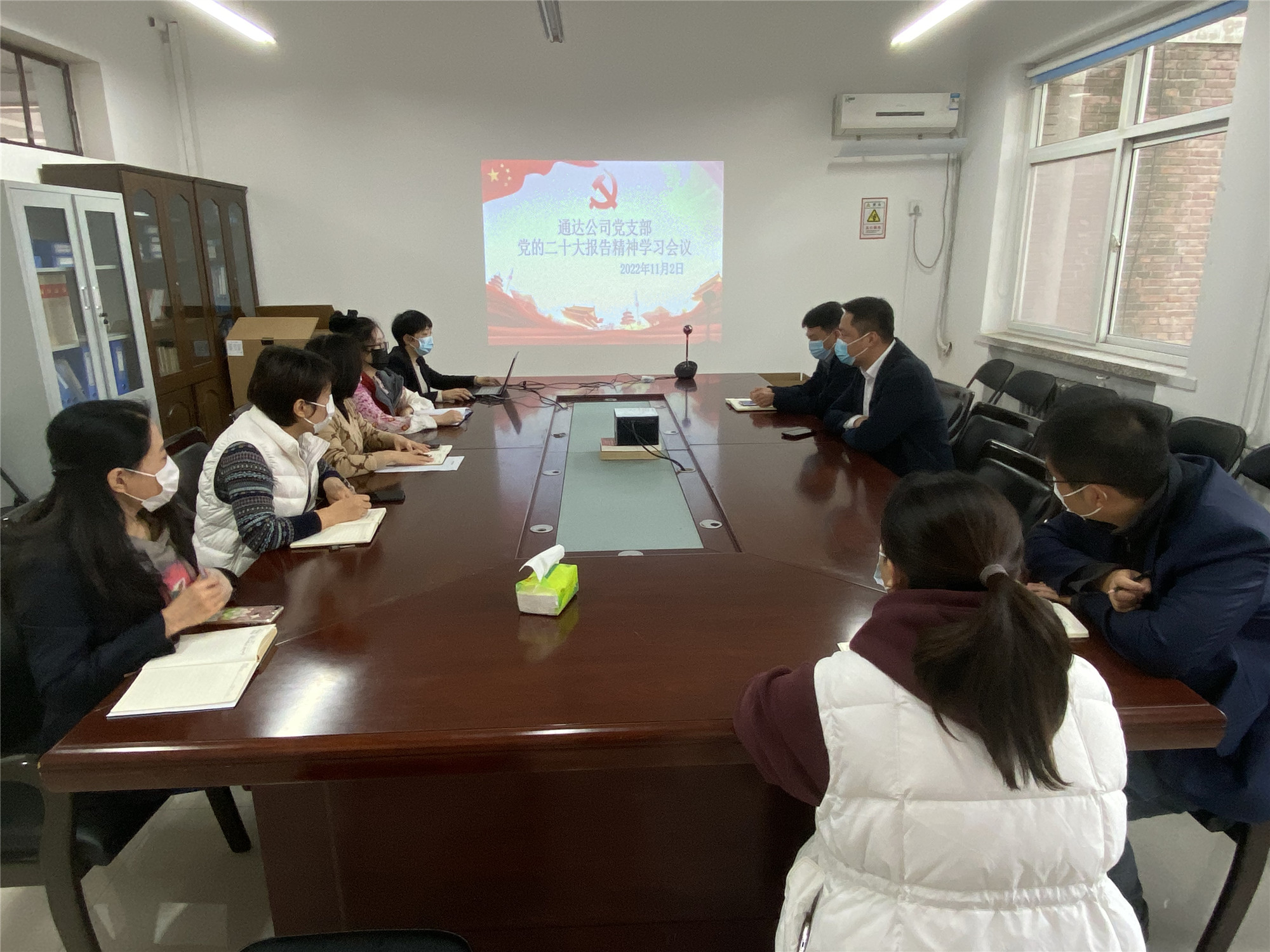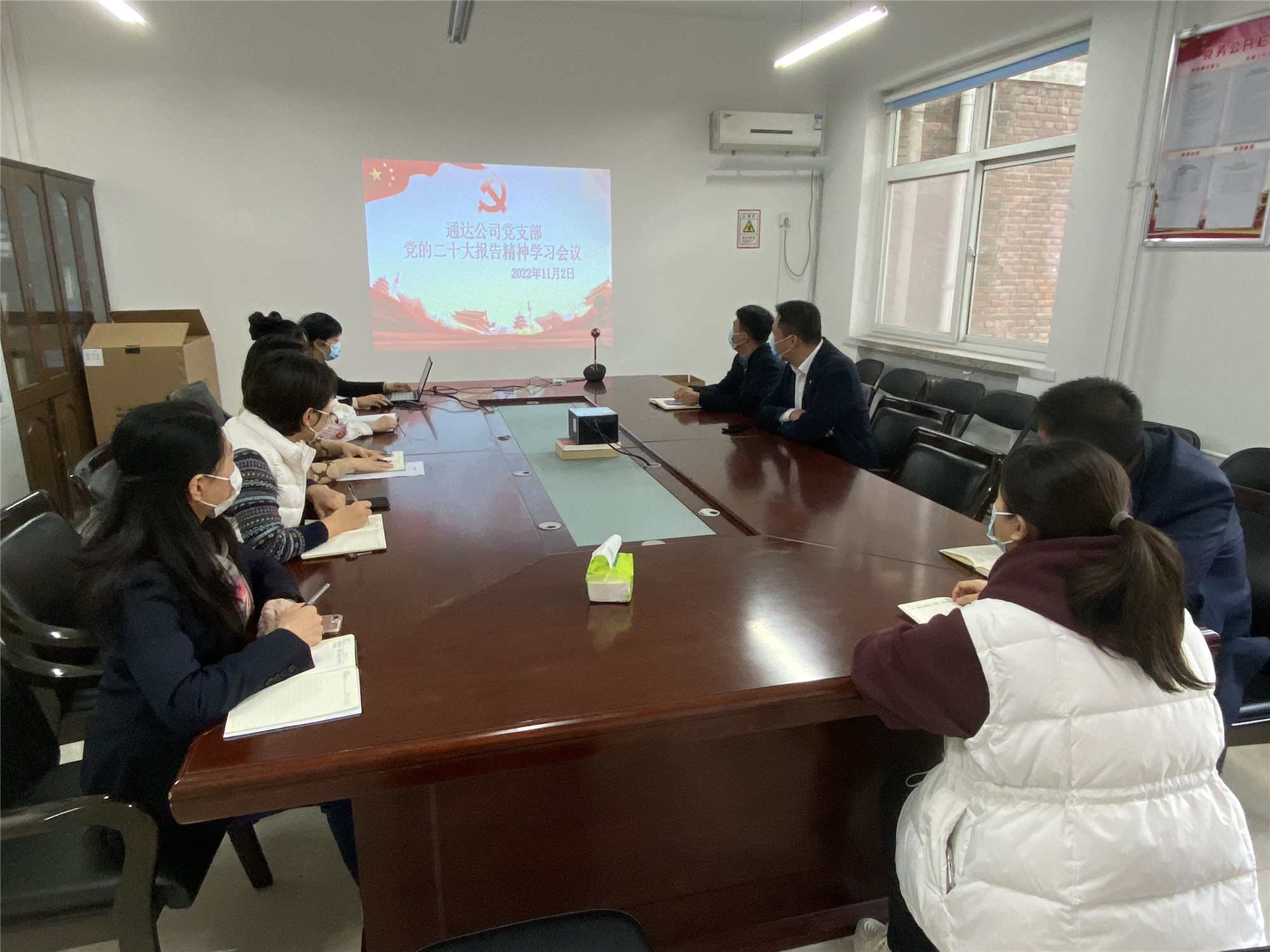 11月2日上午,通达公司党支部召开第四季度党课活动,集中学习党的二十大报告精神。支部书记孙梁宣讲党的二十大精神,分享学习感悟。全体党员干部认真聆听学习。