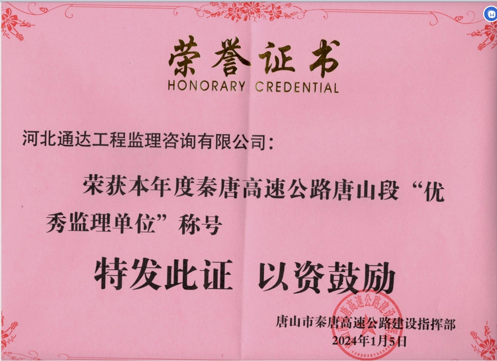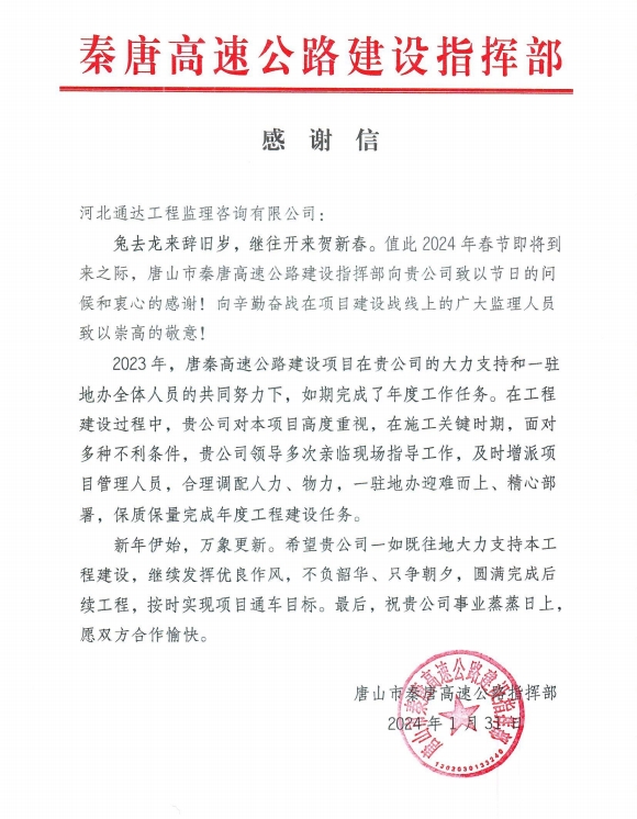 三、秦唐高速公路唐山段项目,荣获“2023年度优秀监理单位”,同时获得项目指挥部“感谢信”。
