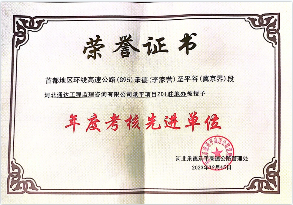 四、首都地区环线高速公路(G95)承德(李家营)至平谷(冀京界)段项目,荣获“年度考核先进单位”。